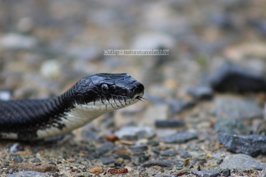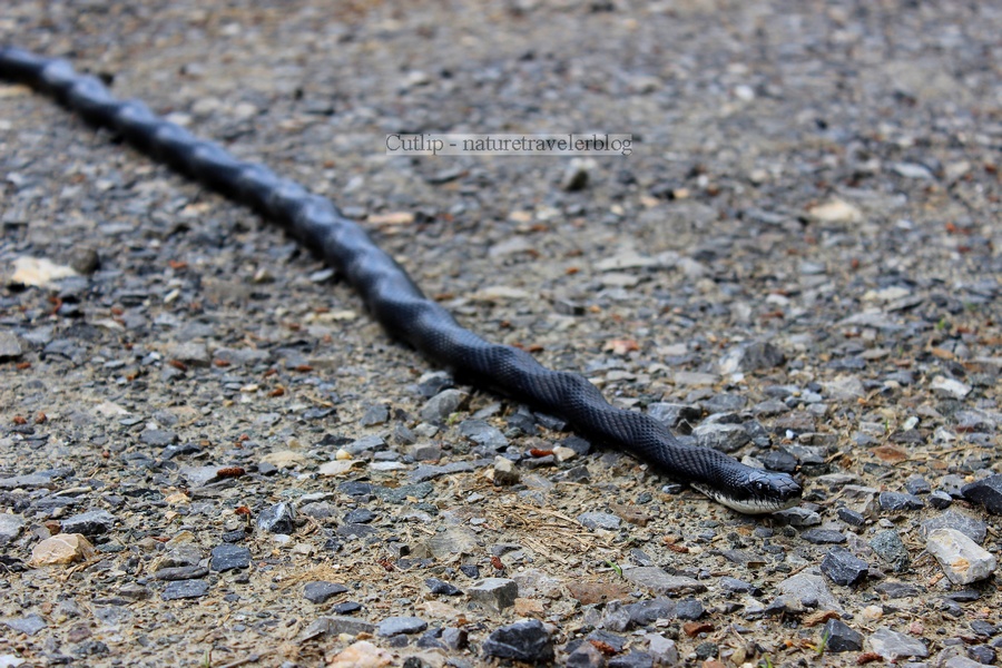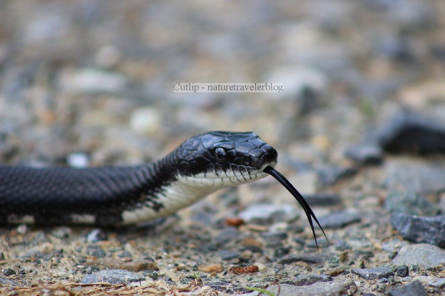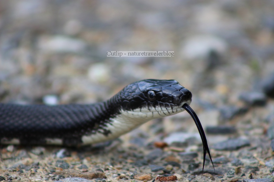 After I took some photos for about a minute, the snake lifted its head and began flicking its tongue toward my direction. I assume it sensed my presence and was investigating further by tasting the air. I walked back to my car to retrieve my zoom lens.